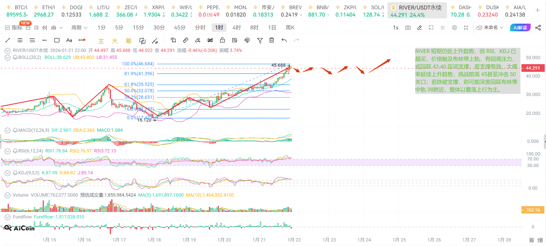 RIVER w ciągu ostatnich kilku dni zachowuje się jakby miało krew z kurczaka, od 40 skoczyło do 45, wydaje się bliskie przełamania wcześniejszego maksimum, nagle pojawia się „głos Fedu” z ostrymi słowami, mówiąc, że wewnątrz ktoś działa przeciwko Powellowi, a w maju może nastąpić zmiana kierownictwa! Po tej wiadomości rynek kryptowalut również drgnął, czy RIVER nie zostanie zniszczone przez tę polityczną burzę? Nie ma co się spieszyć, jak dokładnie działać, kapitan później szczegółowo wyjaśni!