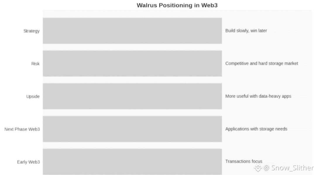 Infrastructure wins slowly—becoming boring, dependable, and hard to replace. The small design studio story illustrates the point: reliability, not features, matters.Walrus distributes storage across decentralized nodes using cryptography and incentives to maintain high availability. The goal is to make data storable, provable, tradable, and governable without trusting a single company.Risks exist: adoption depends on developers and applications, tokenomics can distort behavior, and ecosystem concentration links Walrus’ fate to Sui.The ultimate question: will Walrus become the default place developers store and manage large unstructured data, especially for AI and media? If yes, it could quietly become essential infrastructure. If not, it risks remaining well-funded but underutilized.A simple test: would someone building a real business trust Walrus with critical files for years? The protocol is designed to earn that trust through reliability, long-term availability, and programmable storage. For investors and traders, that’s the core purpose: slow, steady adoption that normalizes decentralized data storage.