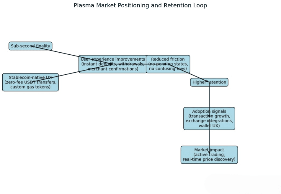 Doświadczenie użytkownika i psychologia ruchu pieniędzy. To jest punkt nietechniczny, ale być może najbardziej znaczący. Ruch pieniędzy jest tak samo psychologiczny, jak techniczny. Gdy opłaty nagle rosną, ludzie opóźniają transakcje. Gdy potwierdzenia zajmują nieprzewidywalny czas, ludzie unikają torów on-chain. Teza Plasma jest taka, że jeśli usuniesz te psychologiczne tarcia, ludzie będą korzystać z łańcucha do codziennych przepływów pieniężnych, a nie tylko do spekulacyjnego przestawiania. Ta zmiana ma znaczenie, ponieważ stabilne użycie tworzy powtarzający się popyt na przechwytywanie wartości, które jest znacznie trwalsze niż jednorazowi spekulanci. Już widzimy finansowe tory, które odniosły sukces, czyniąc powtarzalne, małe działania tanimi i nudnymi. Plasma chce to przetłumaczyć na świat kryptowalut. Różnica jest subtelna, ale ogromna. Jeśli transfery wydają się normalne, ludzie przestają optymalizować sieć i zaczynają optymalizować wyniki biznesowe, na których im zależy. To jest rodzaj adopcji, która się utrzymuje.