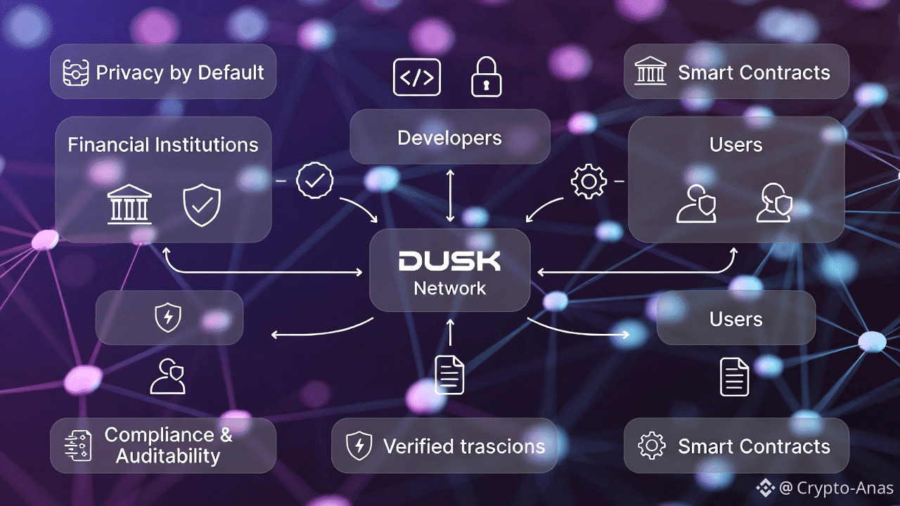 This happens through a layered architecture like DuskDS for settlement and data availability, and DuskEVM or privacy‑centric tools for secure smart contract execution — enabling developers and institutions to build confidential finance applications.