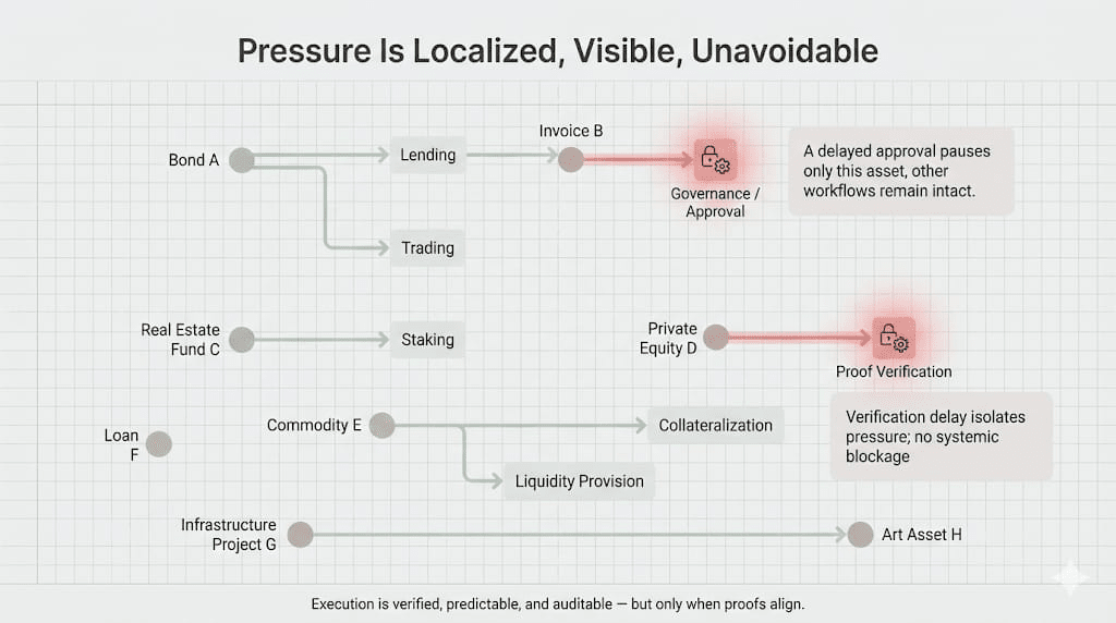 DuskTrade nie tylko przenosi aktywa. Śledzi je pod dowodem. RWAs, od obligacji po faktury, są weryfikowane indywidualnie, podczas gdy ich interakcje z aplikacjami DeFi pozostają izolowane. Zatrzymana obligacja nie psuje przepływów pożyczkowych. Kolejki handlowe dostosowują się. Inne instrumenty pozostają nienaruszone. Nacisk jest zlokalizowany, widoczny i nieunikniony.