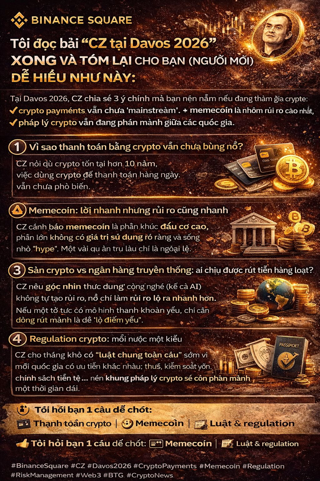 💬 Tôi hỏi bạn 1 câu để chốt: Bạn đang quan tâm phần nào nhất—crypto payments, memecoin hay luật/regulation?