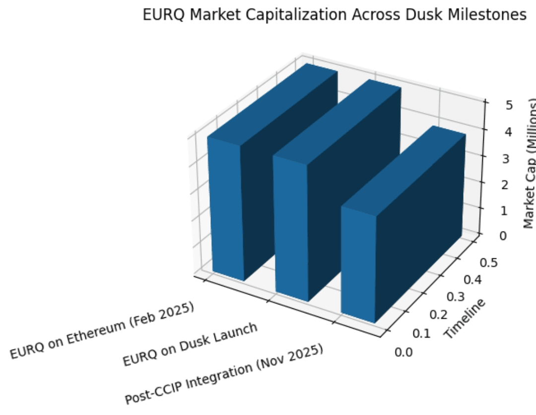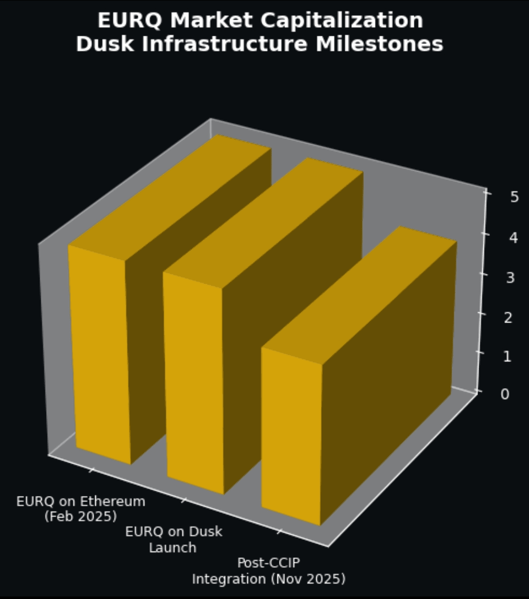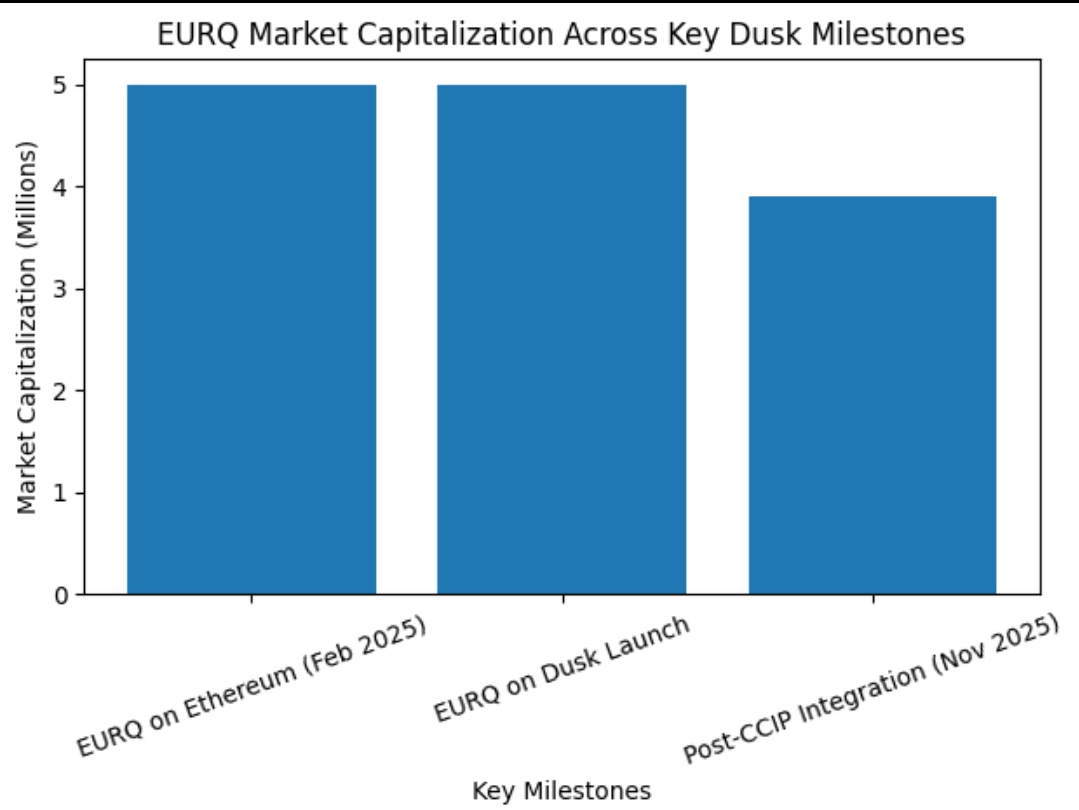 Postęp jest widoczny. 19 lutego 2025 roku Quantoz Payments, NPEX i Dusk wydali EURQ, regulowany cyfrowy aktyw, zabezpieczony euro. W tym czasie raporty pokazały, że EURQ już istniał na Ethereum z około 5 milionami euro kapitalizacji rynkowej i tylko 27 posiadaczami. Przeniesienie go na Dusk nie dotyczyło hype'u wzrostu — chodziło o dopasowanie.