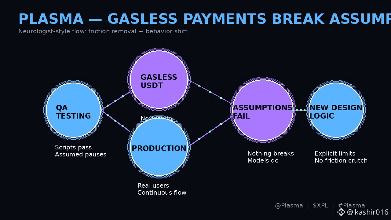 With Plasma’s gasless USDT transfers, that pause disappears. Transactions don’t ask users to think. There’s no moment of hesitation caused by fees, no wallet prompt that forces a decision, no psychological checkpoint where people slow down. Users just move forward. And when that happens, nothing technically breaks—but the assumptions embedded in the tests do.