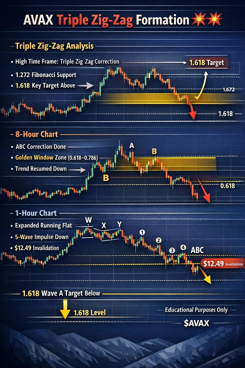 On the higher time frame, $AVAX appears to be forming a triple zig-zag correction. After analyzing the lower time frames more closely, smaller fractals of this correction can also be observed, confirming lower-degree structures within the larger pattern.