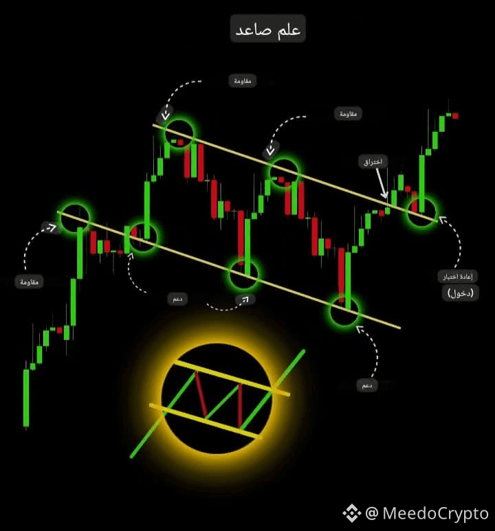 •قبل تشكيل النموذج، هناك حركة صعود قوية (تسمى “سارية العلم”) نتيجة زخم شرائي قوي.