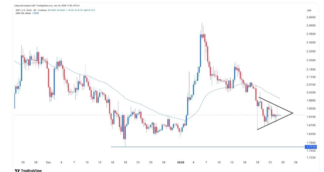 Wykres ośmiogodzinny pokazuje spadek ceny XRP w ciągu ostatnich kilku tygodni, gdzie spadła z najwyższego poziomu 2,4145 USD do obecnych 1,9175 USD.
