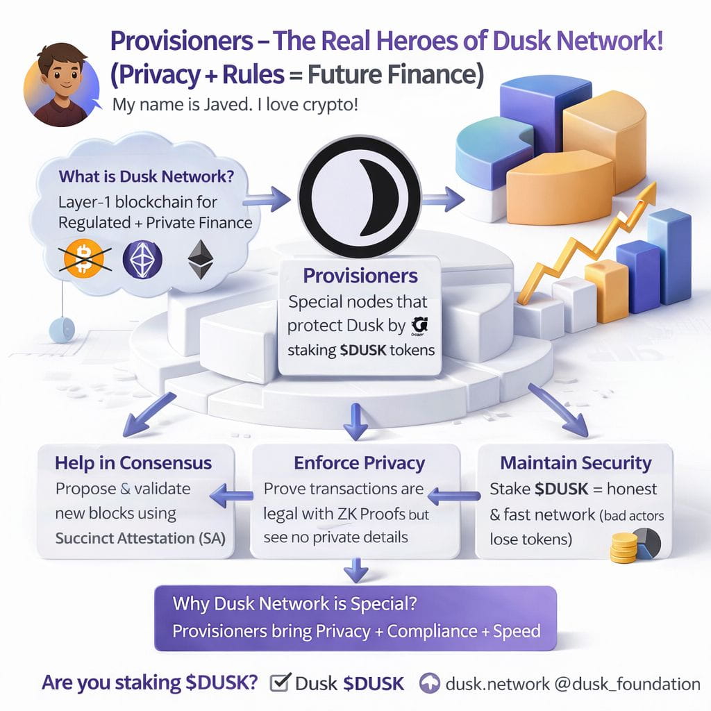 Hi friends! My name is Javed, from India. My English is not perfect, but I love crypto and I want to explain Dusk Network in very simple words so everyone can understand. Today I write about one super important thing in Dusk – Provisioners! They are like superheroes of this blockchain. Let’s talk about them step by step.What is Dusk Network?