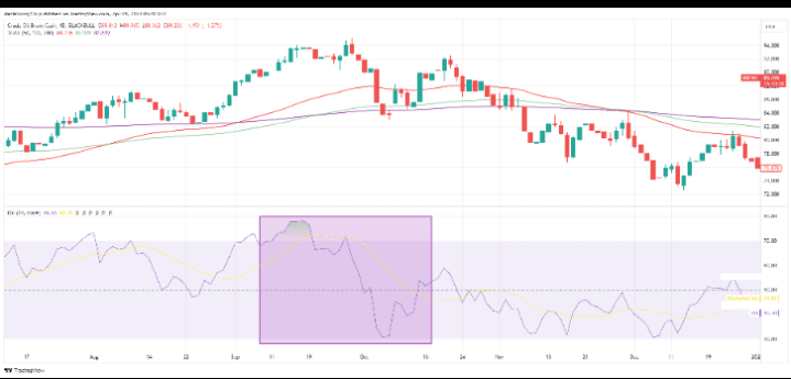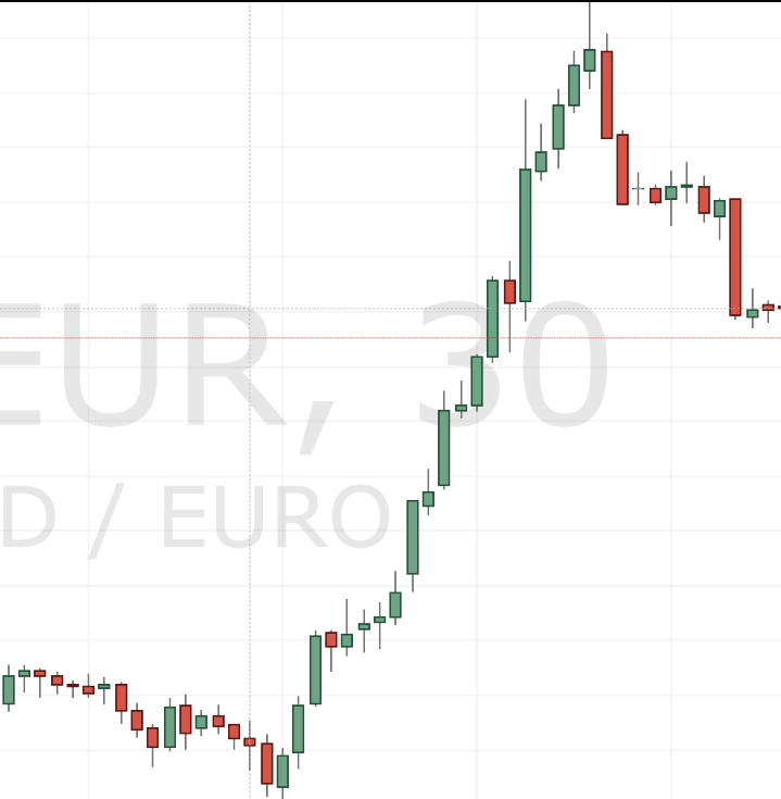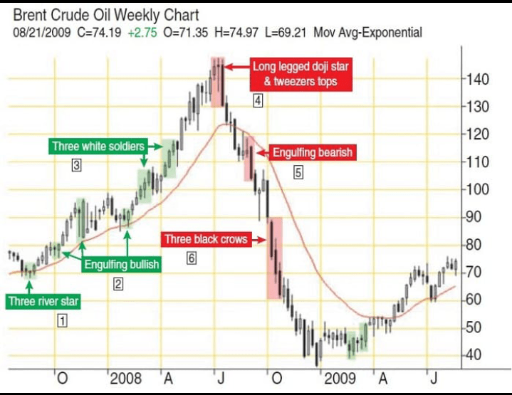 Poniżej znajduje się reprezentatywne zdjęcie świec cenowych ropy (np. Brent Crude) pokazujące zmienność związaną z rozwojem geopolitycznym — napięcia przejawiają się w wycenie ryzyka: