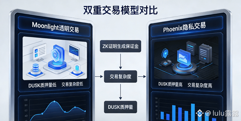 在研究完SBA共识后,我把重点放在了Dusk的双重交易模型Moonlight和Phoenix上,这两个分别对应透明交易和隐私交易的模型,让我看到了DUSK在不同交易场景下的原生作用,它不是简单的统一支付工具,而是会根据交易的隐私属性和合规要求,呈现出完全不同的技术价值。我在测试网里反复调试Phoenix模型的隐私交易,光是为了测准ZK证明生成的保证金扣除阈值,就跑了上百次模拟交易,发现这款基于UTXO模型的隐私交易体系,因为采用了双重Schnorr签名和RingCT环签名技术,在生成零知识证明的过程中,需要用户质押少量DUSK作为证明生成保证金。之所以设置这笔保证金,是因为Phoenix的隐私交易完全依靠密码学证明验证交易有效性,一旦证明生成出现错误,会消耗网络大量的计算资源去核验和修正,而质押的DUSK就是对这种资源消耗的补偿,若证明生成无误,交易完成后保证金会全额返还,若证明存在漏洞或伪造,保证金则会被扣除,用于奖励网络的验证节点。而且在Phoenix模型中,零知识证明的验证节点必须持有并质押一定量的DUSK,持有量的多少直接决定了节点能验证的交易复杂度,比如验证一笔涉及高净值证券通证的机构隐私交易,需要的DUSK质押量远高于普通用户的小额隐私转账,这并非是设置资金门槛,而是因为机构交易的ZK证明电路更复杂,对节点的密码学计算能力要求更高,而DUSK的质押量本质上是对节点技术能力的一种市场化筛选,让更有技术实力的节点参与到高复杂度的隐私交易验证中,保障交易的安全性和效率。而Moonlight作为基于账户的透明交易模型,DUSK的作用则偏向于合规审计的技术支撑,该模型下的Gas费定价并非按交易次数计算,而是和交易的审计复杂度挂钩,比如公开的证券通证转账需要在链上留下完整的审计轨迹,其消耗的DUSK远高于普通的透明转账,而这些消耗的DUSK会全部奖励给链上的合规审计节点,这些节点同样需要持有并质押DUSK才能获得审计资格,这就让DUSK的持有者成为了网络合规审计的核心参与者,让通证的流通和网络的合规性落地形成了直接联动。