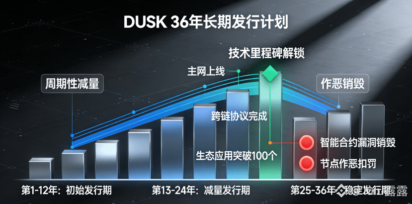 我也仔细研究过DUSK的发行模型和销毁机制,发现这两个设计让其通证经济具备了极强的可持续性,也让通证的供应和消耗始终与网络的技术落地、安全运行深度绑定。DUSK采用36年的长期发行计划,总供应量上限为10亿枚,每四年进行一次周期性减量,这种设计的核心,是让DUSK的通胀始终围绕网络的技术发展和实际效用展开,而非按固定时间无意义增发。在网络发展初期,新发行的DUSK主要用于奖励密码学研究、节点技术升级、合约开发等技术贡献,激励参与者为网络的技术落地做贡献,而随着网络的成熟,尤其是合规资产代币化、MiCA合规支付通道的落地,链上交易的Gas费需求会逐步提升,节点的奖励会慢慢从新铸代币转向Gas费分成,最终实现网络效用驱动代币需求的良性循环。而且DUSK的初始代币分配中,发展基金的代币解锁完全和技术开发里程碑挂钩,比如PLONK证明系统的递归升级、Lightspeed L2的上线、Citadel身份系统的落地,都会解锁相应的发展基金代币,不会出现团队和投资机构的无意义解锁,避免了市场抛压。在销毁机制上,DUSK也并非只有简单的跨链迁移销毁,还包括作恶节点的保证金扣除、恶意行为的身份保证金销毁、代码漏洞的安全保证金扣除等,这些销毁行为都和网络的安全运行、技术质量挂钩,比如2025年下半年,我在测试网中观测到某节点在Phoenix交易验证中恶意伪造零知识证明,导致近10万枚DUSK被扣除销毁,这种销毁直接减少了流通量,也让DUSK的通缩和网络的安全程度形成了直接联动。