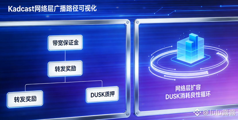 Kadcast网络层作为Dusk替代传统流言协议的创新设计,其高效运行和扩容同样离不开DUSK的原生支撑,这也是我觉得DUSK设计最细致的地方,它把通证的作用延伸到了网络层,让通证的消耗和奖励与网络的带宽、效率、稳定性深度绑定。我在测试网里做过Kadcast网络层的广播效率测试,对比传统流言协议,Kadcast通过Kademlia风格的确定性多播路径转发消息,能减少25%-50%的带宽使用,而想要接入这个网络层成为节点,首先需要质押一定量的DUSK作为带宽保证金,节点的上下行带宽越稳定、丢包率越低,获得的DUSK奖励就越多,比如一个丢包率低于0.5%、带宽达到500Mbps以上的节点,其获得的DUSK奖励是丢包率5%的节点的3倍,这种设计让节点愿意主动优化硬件设备,提升网络的整体广播效率。而Kadcast网络层的消息转发节点,每成功转发一个区块、投票或交易消息,都会获得少量的DUSK奖励,奖励的多少和转发的及时性、准确性挂钩,若节点出现延迟转发、错误转发的情况,不仅会失去奖励,还会被扣除部分质押的DUSK,这就让节点更注重转发的质量,也让整个网络层的消息传播更高效、更可靠。甚至Kadcast网络层的扩容,也需要消耗DUSK来部署新的路由节点,扩容的规模和消耗的DUSK数量直接挂钩,比如想要将网络的交易处理吞吐量提升一倍,需要消耗相应数量的DUSK来部署新的路由节点,而这些消耗的DUSK并非直接销毁,而是用于奖励参与扩容的技术开发节点,这就让DUSK的消耗成为了网络层扩容的技术动力,也让整个网络的发展形成了“通证消耗-技术扩容-网络效率提升-通证需求增加”的良性循环。