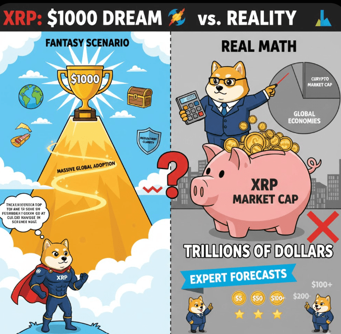 Niektórzy analitycy i entuzjaści kryptowalut spekulowali, że XRP może osiągnąć niezwykle wysokie ceny, takie jak $1,000 w bardzo specyficznych warunkach — takich jak masowa globalna adopcja w płatnościach, duże wsparcie instytucjonalne, klarowność regulacyjna i przechwycenie przez XRP dużego udziału w globalnym wolumenie transakcji. Niektóre prognozy cenowe na dłuższą metę sugerują, że może to nastąpić w odległej przyszłości (na przykład do 2030 roku).