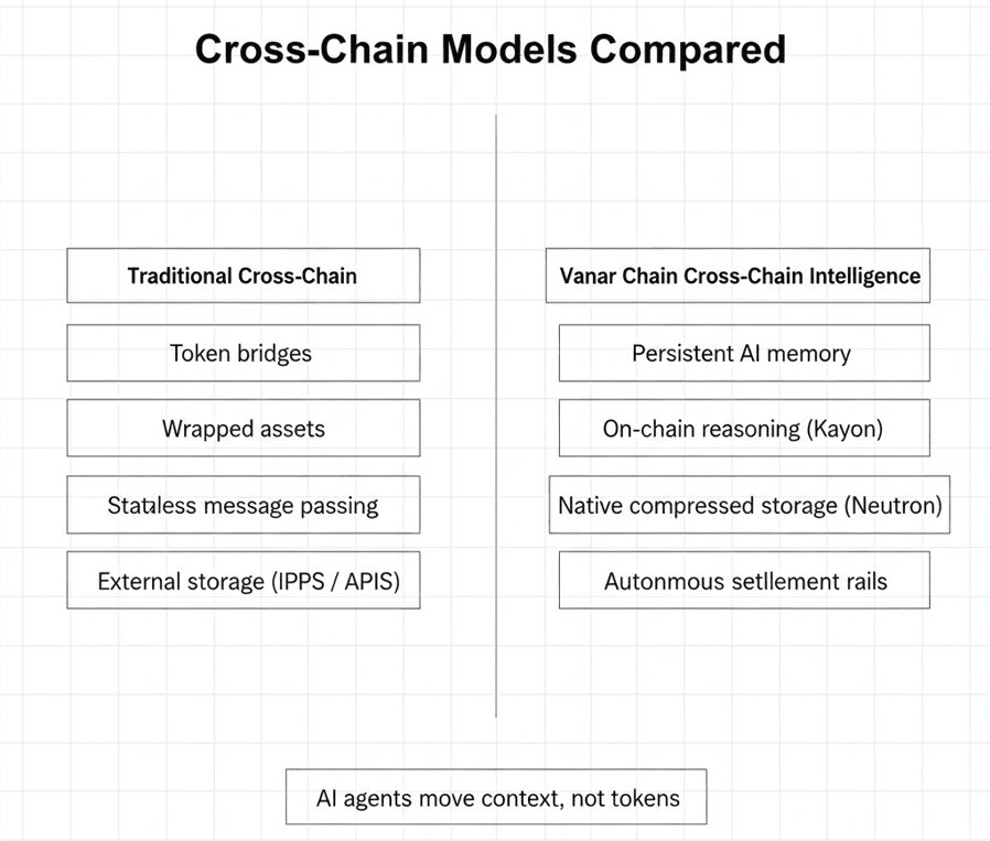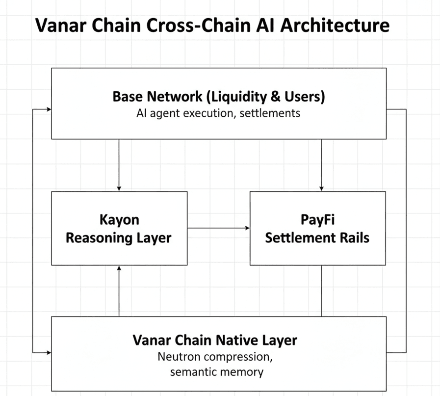 W teorii, AI między łańcuchami jest eleganckie. Agent wykonuje na Base, gdzie żyje płynność. Skondensowane dane żyją na Vanar Chain, gdzie Neutron obsługuje przechowywanie w proporcjach 500:1. Kayon zapewnia warstwę rozumowania bez względu na środowisko wykonawcze. Wszystko działa, ponieważ łańcuchy bloków są kompozytowe, a API są uniwersalne.