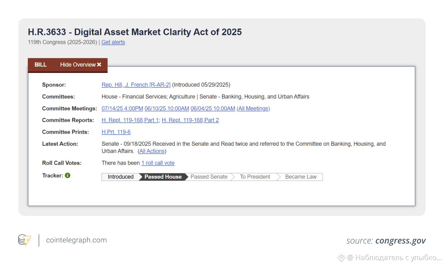 Если закон CLARITY будет принят в совместимой форме, он станет первой всеобъемлющей федеральной основой США для структуры рынка цифровых активов.