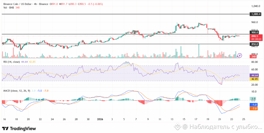 Несмотря на недавние колебания рынка, по состоянию на 24 января 2026 года Binance Coin сохранила стабильность выше 890 долларов. В то время как на прошлой неделе криптовалюта столкнулась с медвежьей тенденцией, ее цена держалась стабильно, демонстрируя сопротивление на ключевых уровнях. Настроения рынка остаются нейтральными: индекс относительной силы (RSI) составляет 44, что позволяет предположить отсутствие немедленных условий перекупленности или перепродажи.