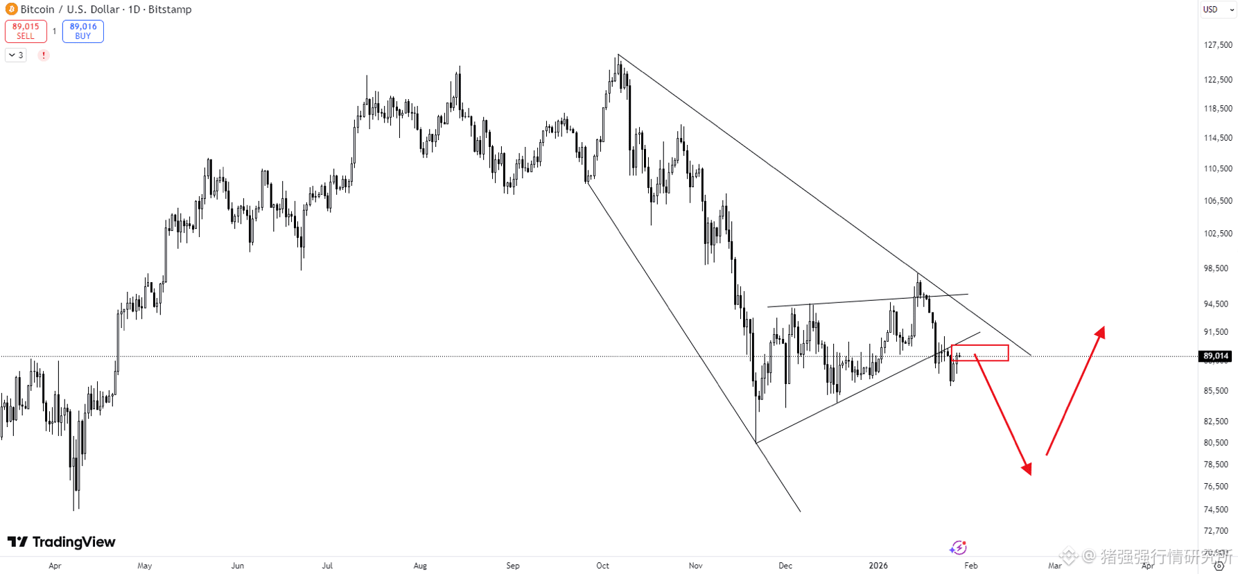 日线上 顶部到现在扩散形态 中部有一个中继形态,未来几日跌破81000的概率非常大,不过,跌破后也会存在极大的反转行情。