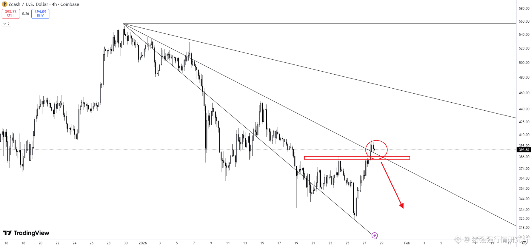 $zec 波动大 圆圈不确定是不是假突破 要做只能跌回红色区域后再测试2/3才能确认。