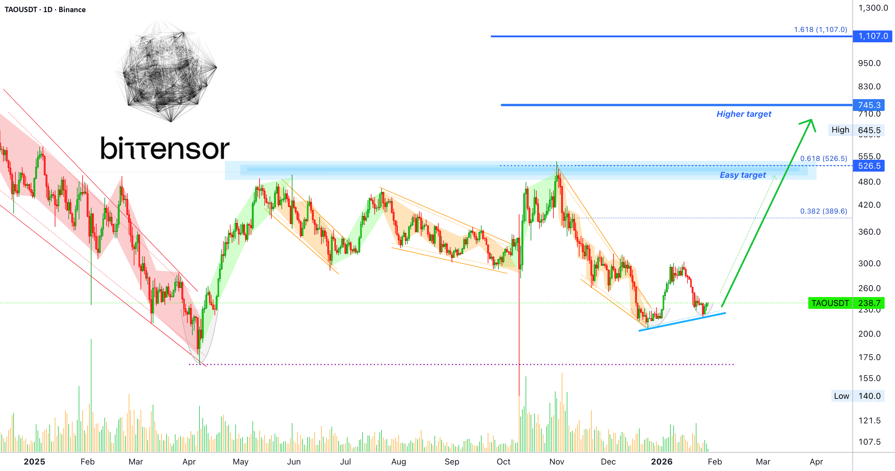 Oto przychodzi Bittensor i to jest idealne ustawienie z doskonałym timingiem oraz ogromnym potencjałem wzrostu. Zwróć uwagę na wyższy dołek i zaokrąglony dół. Zwróć uwagę na "łatwy cel." Oczywiście, bardzo łatwym celem jest $390, co otwiera 320% potencjału zysku przy 5X, bardzo, bardzo łatwe.