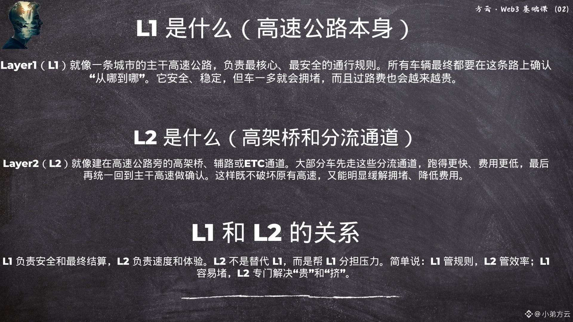 L1 负责安全和最终结算,L2 负责速度和体验。L2 不是替代 L1,而是帮 L1 分担压力。简单说:L1 管规则,L2 管效率;L1 容易堵,L2 专门解决“贵”和“挤”。