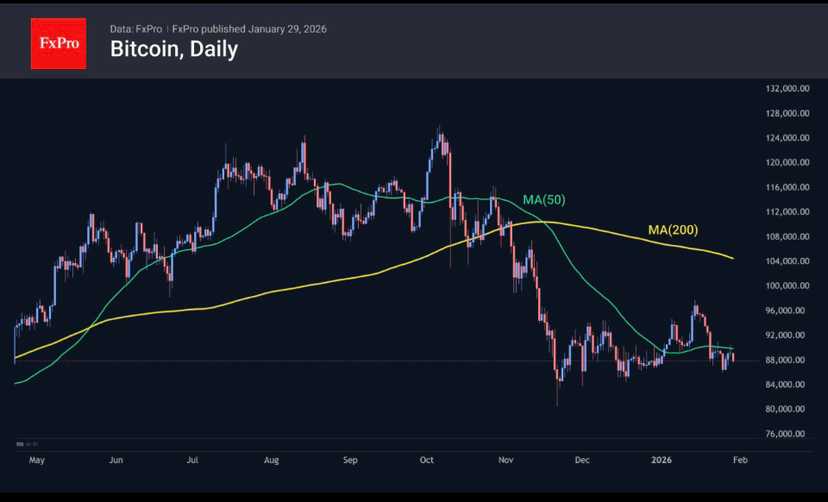 W Bitcoinie w środę wieczorem realizowano kolejną porcję transakcji sprzedaży w próbach rynku, by wzrosnąć powyżej 90K $, nieudanie próbując wrócić powyżej 50-dniowej średniej ruchomej. Ta krzywa łagodnie się zakrzywia w dół, dodatkowo wzmacniając argumenty niedźwiedzi. Z drugiej strony, BTC jeszcze nie rozpoczęło aktywnego spadku po konsolidacji. Formalnym sygnałem do startu może być złamanie wsparcia w pobliżu 85K $. Ważne pytanie, jeśli metale nagle się odwrócą w dół, czy to pomoże kryptowalutom, przywracając do nich zainteresowanie, czy jeszcze bardziej zaszkodzi? Skłaniamy się ku drugiej opcji z powodu potencjalnego delewarowania, niebezpiecznego dla wszystkich ryzykownych aktywów na pierwszym etapie. To stan zugzwang, w którym następny ruch tylko pogarsza sytuację.