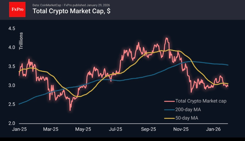 Rynek kryptowalut wciąż pozostaje na uboczu, nie mogąc dołączyć do rosnących rynków akcji i metali. Nagle kryptowaluty już nie wyglądają na alternatywę dla walut fiducjarnych i ochronę przed zbyt nieodpowiedzialną polityką finansową największych państw. Słaba wydajność kryptowalut z gwałtownym wzrostem zainteresowania metalami szlachetnymi w ślad za cenami. W rezultacie kryptowaluty tymczasowo wyglądają na źródło środków do wzmocnienia pozycji w złocie i srebrze. Przy tym kryptowaluty nie tracą ważnych lokalnych poziomów wsparcia, co dotyczy zarówno kapitalizacji rynku jako całości, jak i poszczególnych monet – Bitcoin, Ethereum, XRP, Solana.