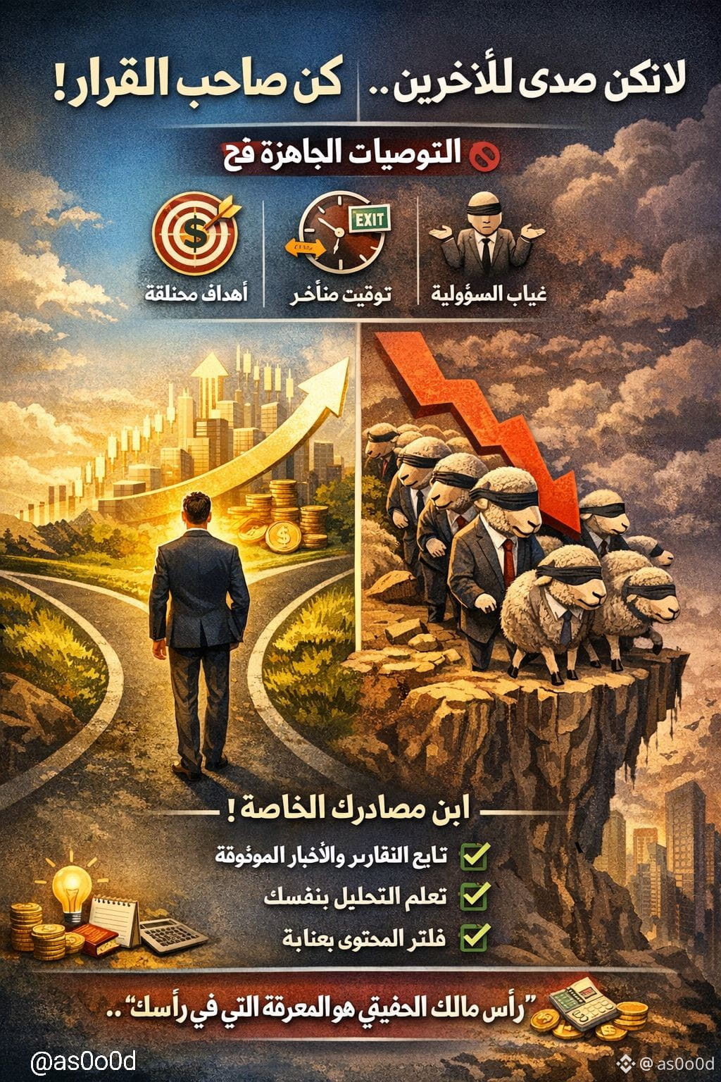 * اختلاف الأهداف: من ينصحك قد يملك رأس مال ضخماً يتحمل الخسارة، بينما أنت قد تخاطر بمدخراتك الأساسية.
