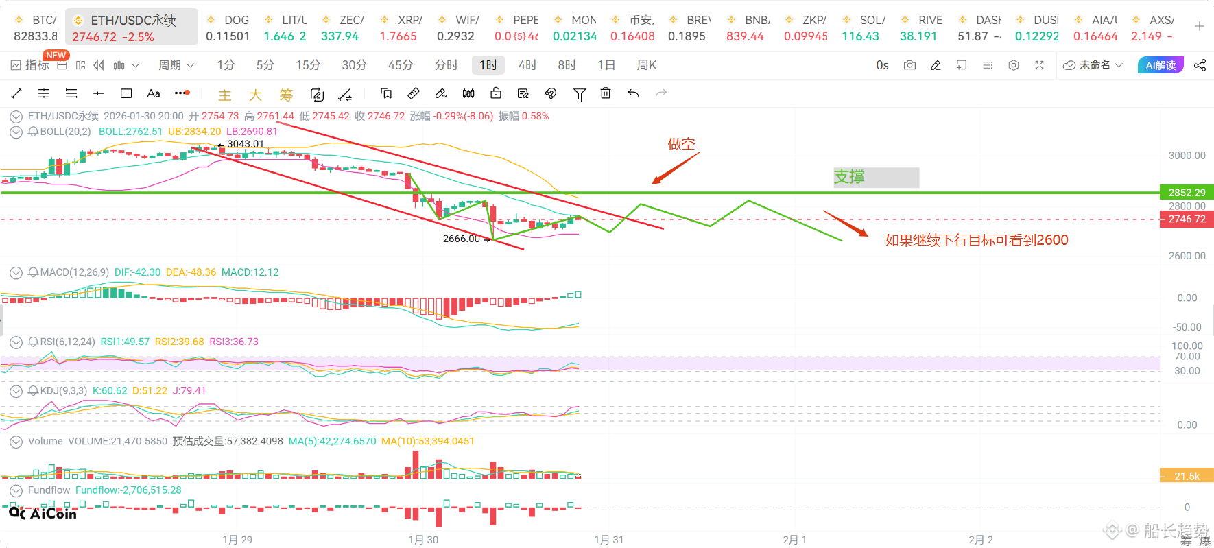 总结看法:1小时级别技术结构已经走坏,多个指标同步显示空头占优。结合BOLL收口和价格位置,向下突破的概率远大于向上反弹。如果你不知道具体的入场时机和出场点位,以及在持仓的粉丝们可以关注船长,船长会24小时在船长村里公布每日的币种和进场点位以及出场时!
