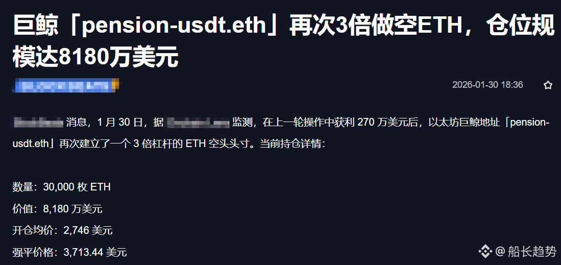 消息面:巨鲸养老金再次出手,270万盈利后加码做空