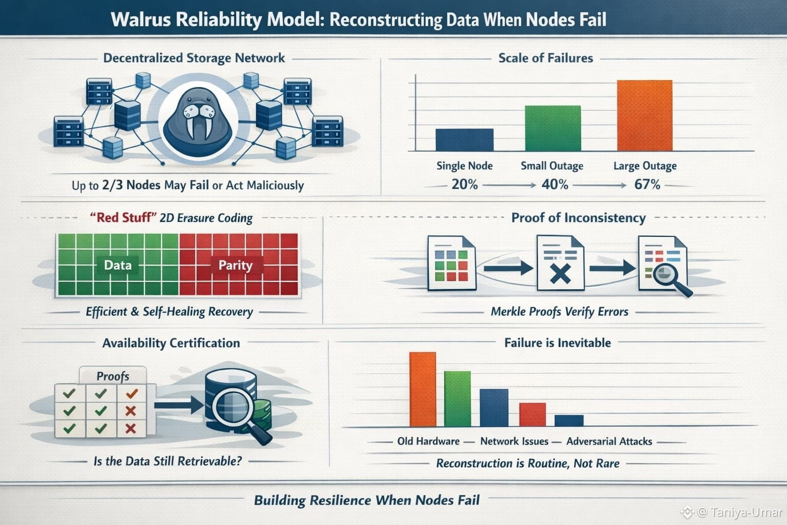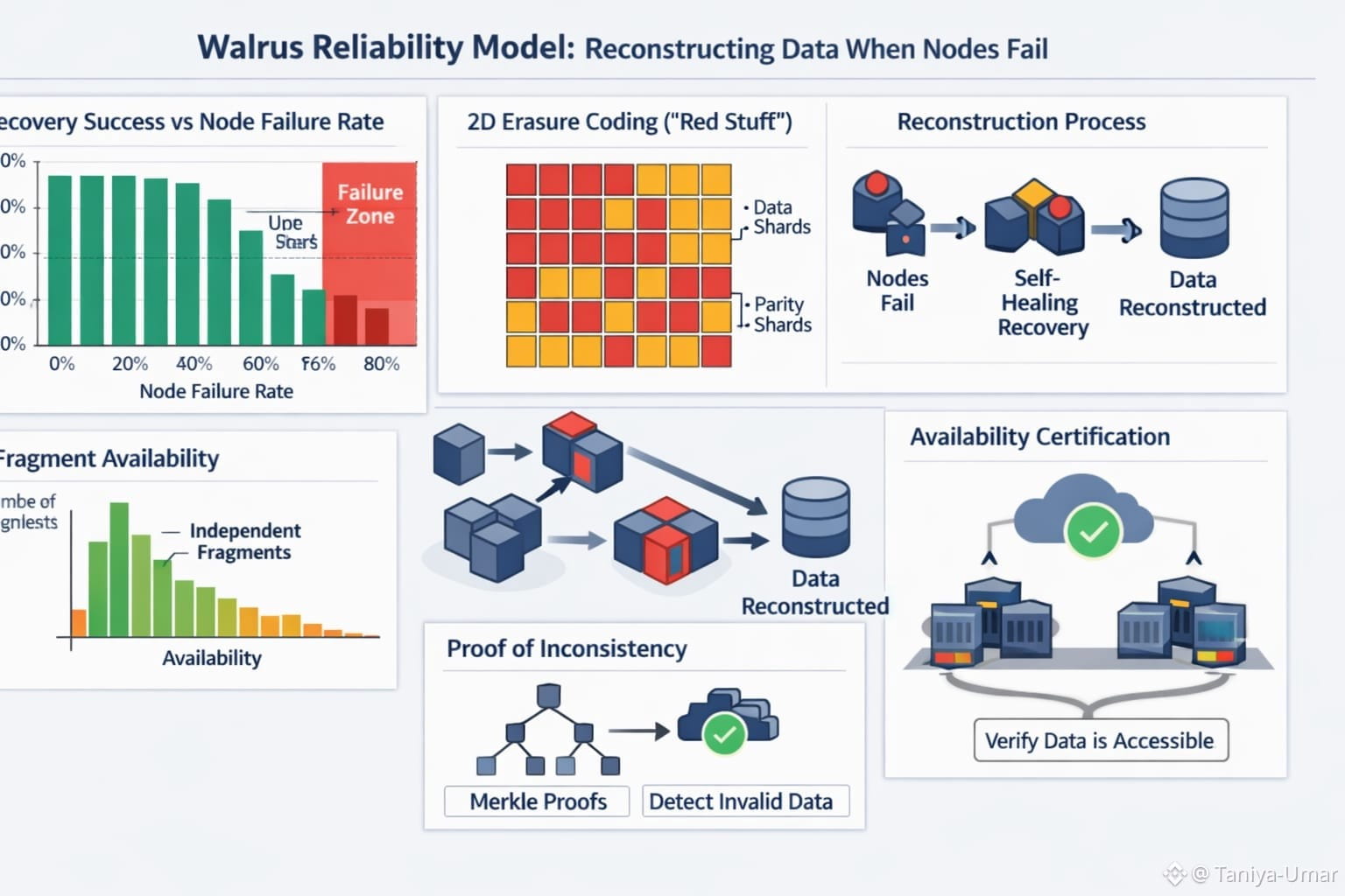 What makes Walrus feel especially relevant to the title—reconstructing data when nodes fail—is that it talks openly about what happens when reconstruction doesn’t line up. The Walrus whitepaper describes a “proof of inconsistency,” where a storage node can share the specific symbols it received for recovery along with Merkle proofs, so others can verify that something has gone wrong. Instead of crossing our fingers that every node plays nice, the protocol assumes they won’t—and builds in a way to catch it. Reliability isn’t “nothing ever breaks.” It’s “when something breaks, we can show exactly what happened.” Reliability, here, isn’t just “it works.” It’s “we can prove what happened when it didn’t.”