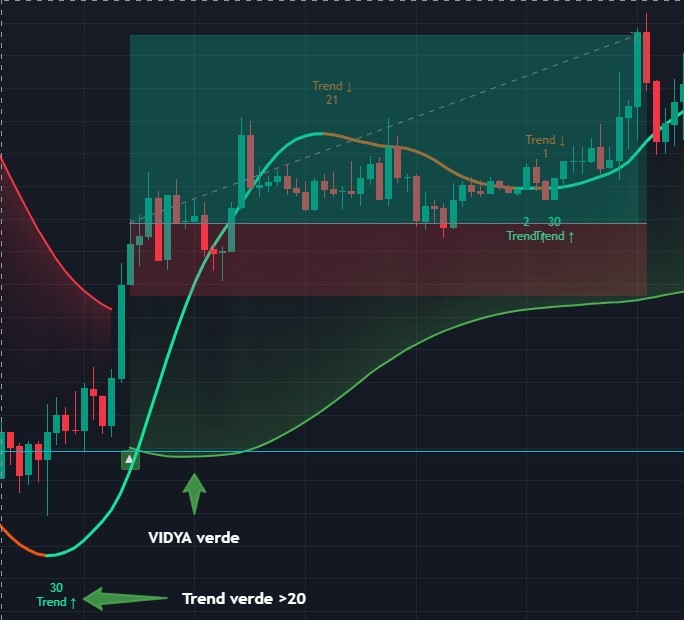 Gdy pojawi się etykieta „Trend” z wartością równą lub większą niż 20 (liczba świec, które wskaźnik szacuje, że trend będzie kontynuowany) i kolor będzie zgodny z kolorem Volumetric VIDYA: