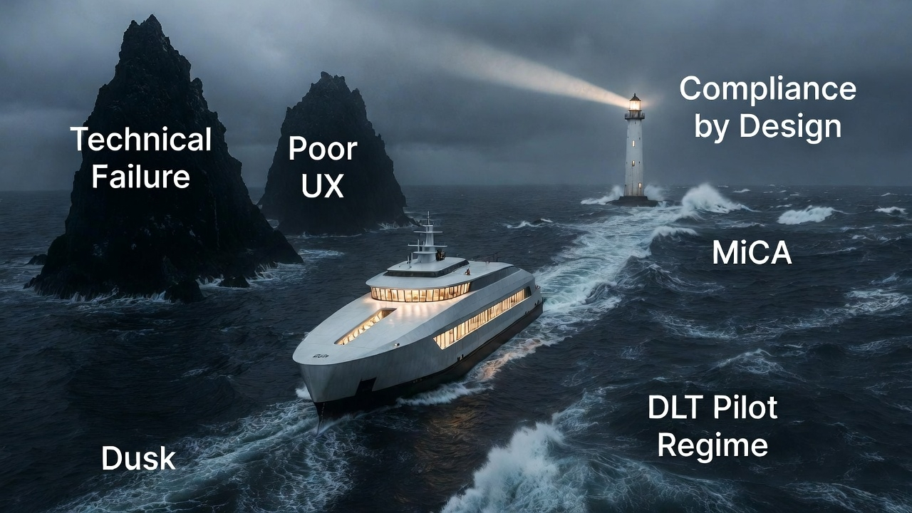 Droga Dusk jest celowo wyznaczona przez europejskie wody, kierowana przez dwa kluczowe instrumenty regulacyjne: Rozporządzenie o Rynkach w Aktywach Krytograficznych (MiCA) oraz Reżim Pilotażu DLT.