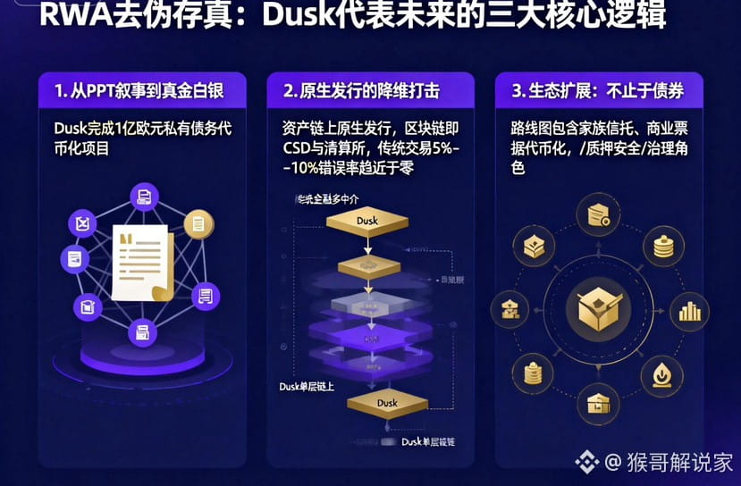 而Dusk的野心在于 “原生发行” 。资产从诞生第一天起就在链上,区块链本身就是中央证券存管机构(CSD)和清算所。这意味着什么?传统金融交易中因为五六道中间环节产生的5%-10%的错误率,在Dusk上可以趋近于零。对机构来说,节省的巨额纠错和中介成本,就是实打实的利润。这才是金融机构无法拒绝的、直击痛点的价值。