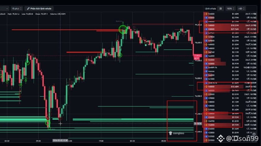 BTC lekko odbija do 77.xxx, wielu z was zaczyna czuć się niespokojnie i chce „zrewanżować się” po dipie. Ale poczekajcie! Spójrzcie na książkę zleceń wielorybów, aby zobaczyć wyraźnie: rekiny zakładają ogromną klatkę, a jeśli nie widzicie ściany zleceń, to wy sami jesteście płynnością, aby mogły się zrealizować zlecenia.