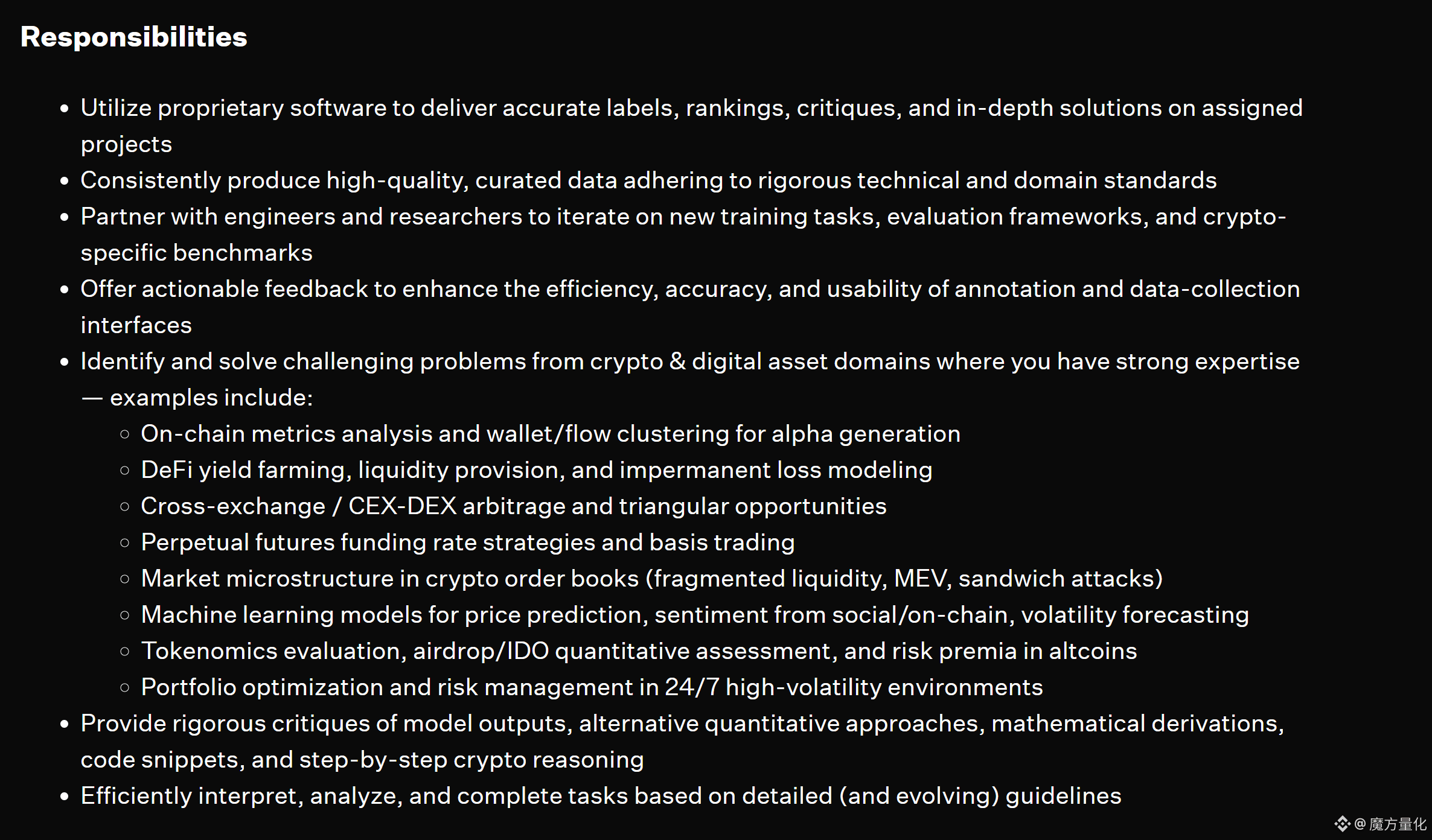 作为岗位的一部分,该加密货币专家还将“识别并解决加密货币领域的复杂问题,包括市场微观结构问题,例如流动性碎片化和与矿工可提取价值(MEV)相关的执行风险。