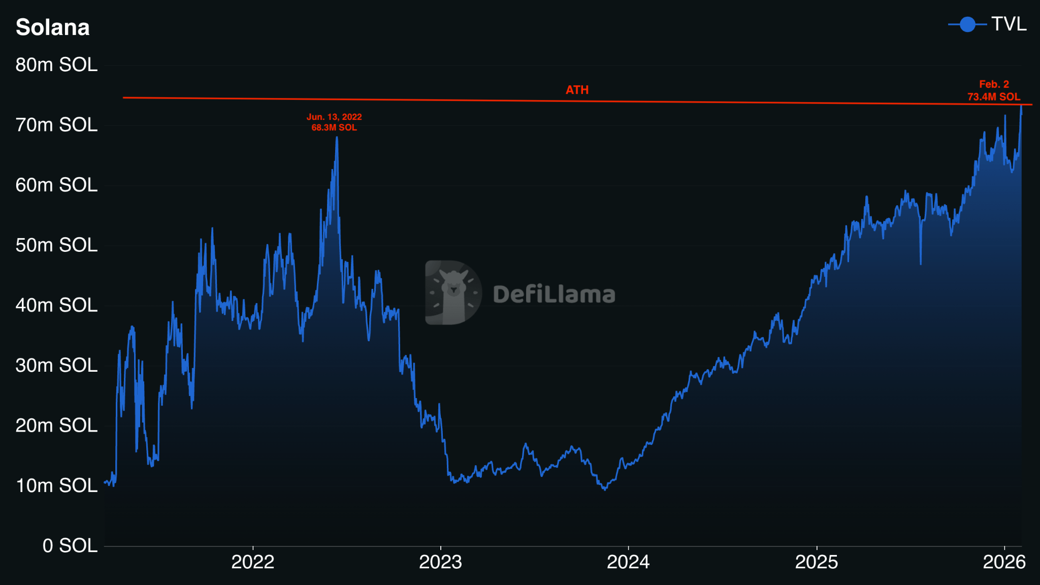 Ostatni raz ten wskaźnik osiągnął dzienny szczyt w czerwcu 2022 roku, kiedy to TVL osiągnęło 68.300.000 SOL. Wówczas korzystało na tym zainteresowanie NFT Solany z 2021 roku oraz wzrost aktywności sieci. W tym okresie cena SOL wzrosła o 80% od czerwca do sierpnia.