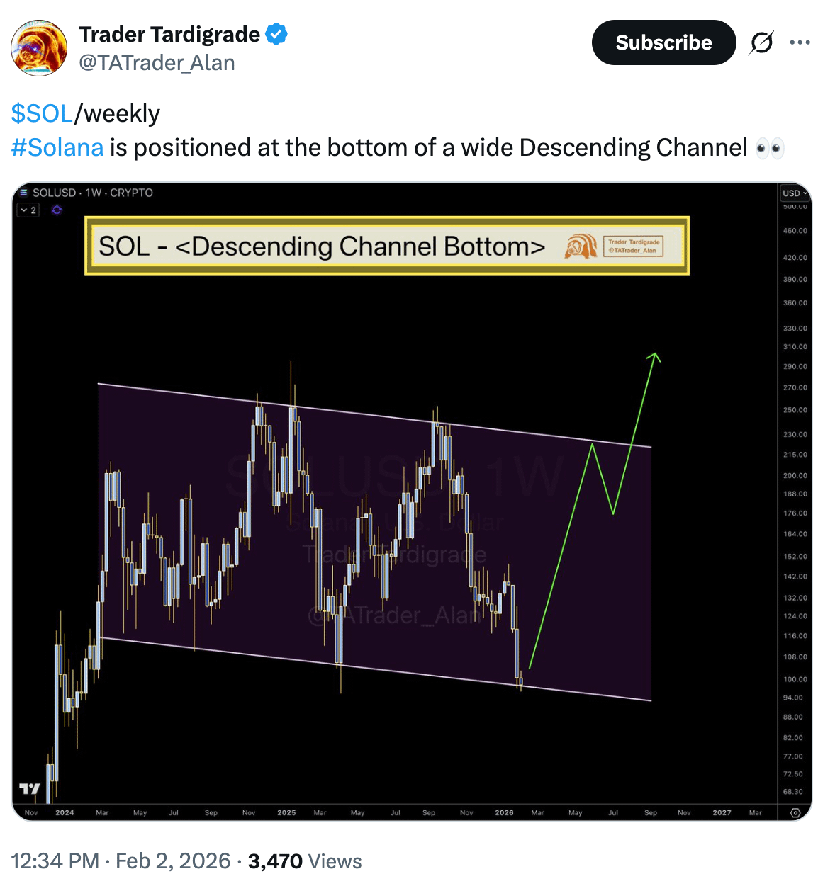 Trader Tardigrade uważa, że po odbiciu od dolnej krawędzi kanału spadkowego, SOL ma szansę wzrosnąć do górnej krawędzi 215 dolarów.