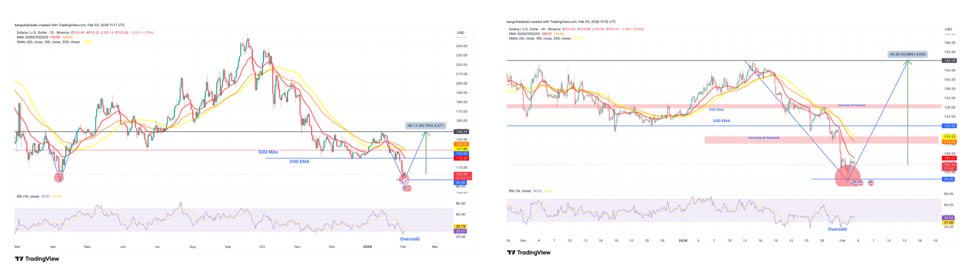 Według raportu Cointelegraph, jeśli wskaźnik EMA z dnia 20 znajdzie się na poziomie 106 dolarów i powróci jako wsparcie, cena SOL może dalej odbić się do przedziału 120-150 dolarów.