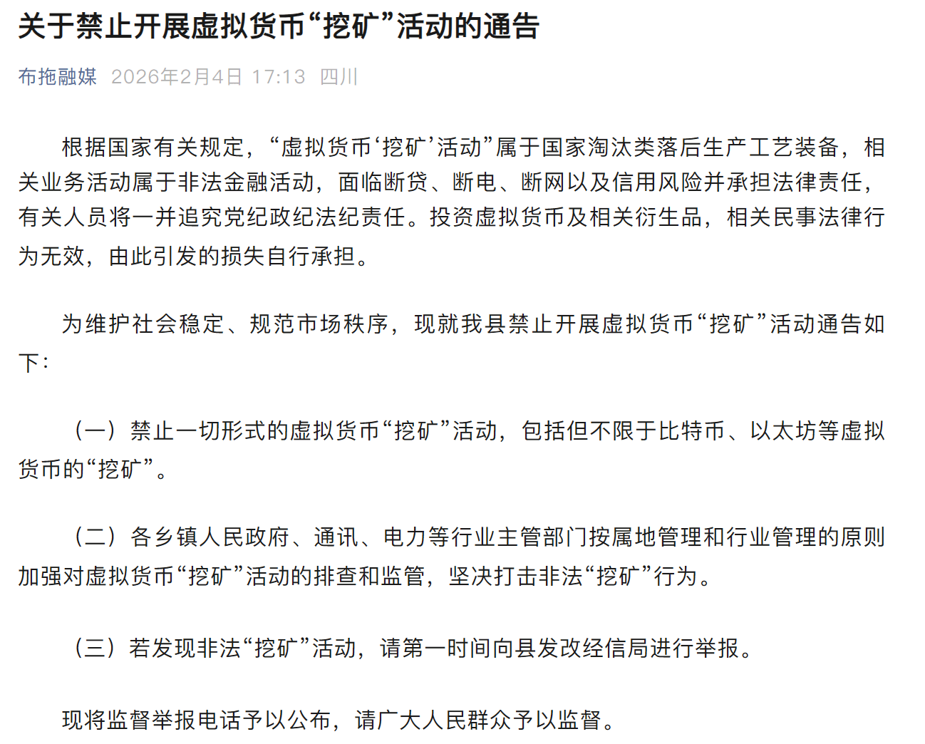 Chiny, powiat Butuo w prowincji Syczuan, opublikowały ogłoszenie 'zakazujące prowadzenia działalności związanej z wydobywaniem wirtualnych walut'