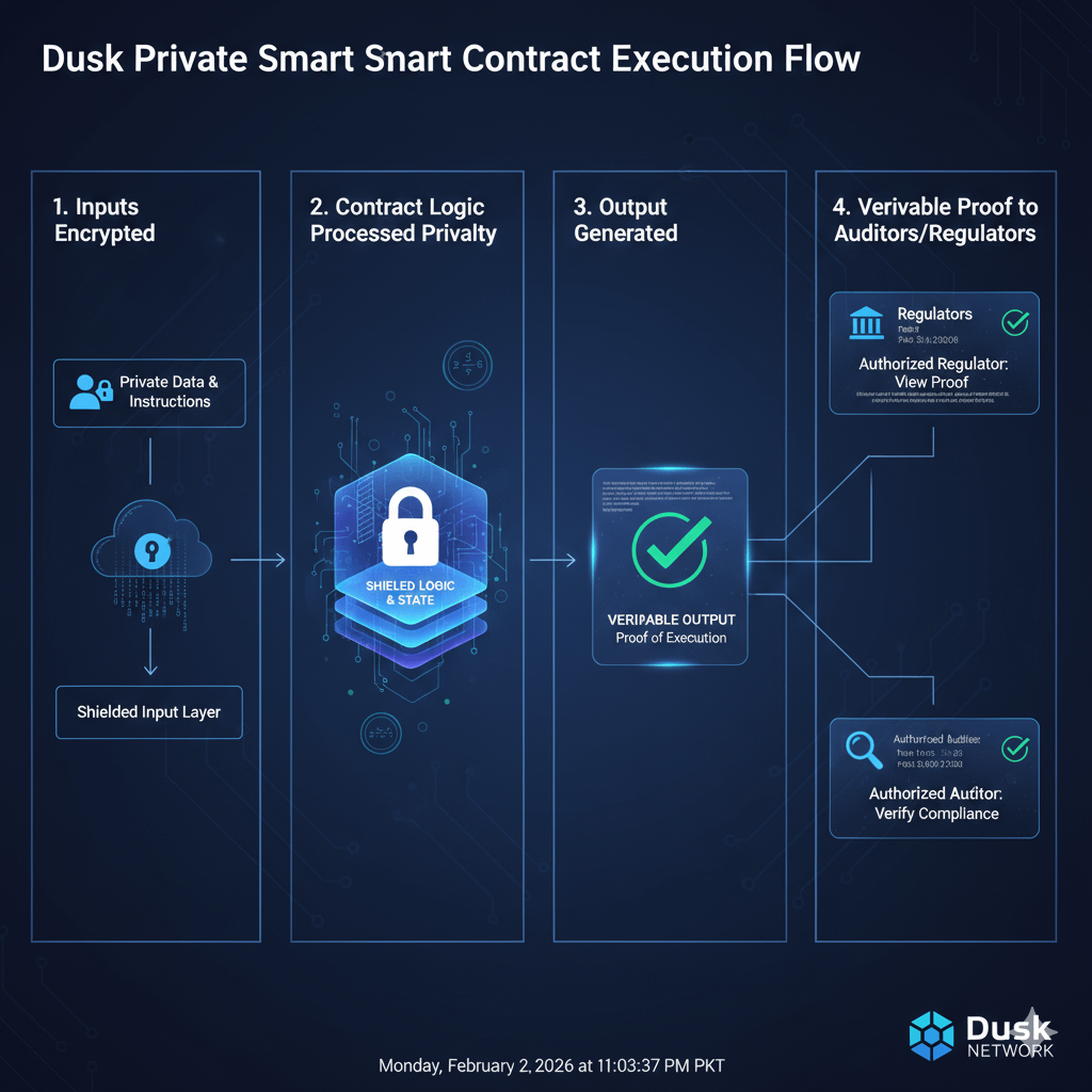 Dusk introduz contratos inteligentes privados que executam de forma confidencial. A lógica de negócios, condições e resultados são ocultados do público enquanto permanecem verificáveis. Isso possibilita novas classes de aplicações, como empréstimos privados, leilões confidenciais, trocas regulamentadas e DeFi institucional.