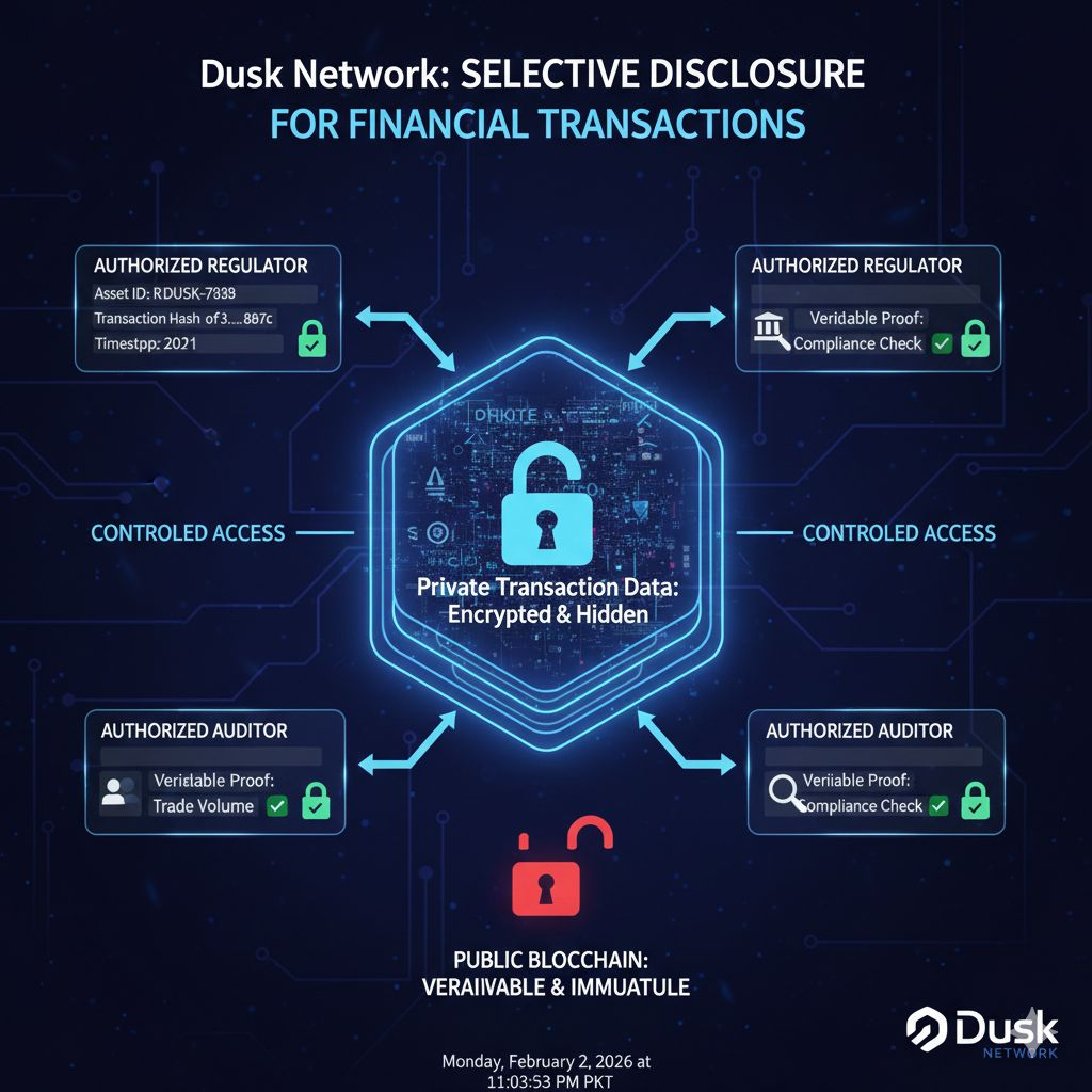 A divulgação seletiva é uma das inovações mais importantes do Dusk. Em vez de escolher entre total transparência ou total segredo, Dusk permite que projetos operem privadamente por padrão e revelem informações condicionalmente.