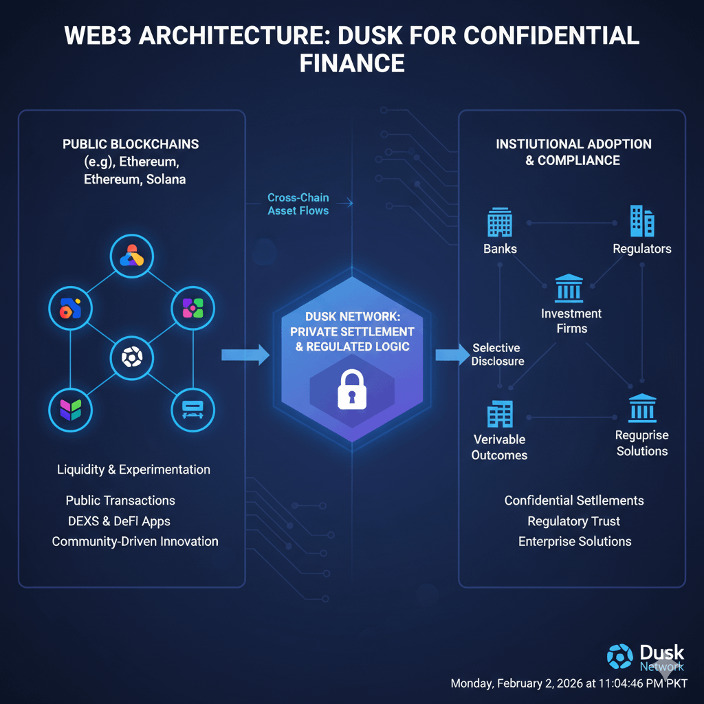 Dusk não está tentando substituir Layer 1s existentes. Em vez disso, complementa o ecossistema mais amplo, focando no que os outros ignoram. Chains públicas lidam bem com liquidez aberta e experimentação sem permissão. Dusk lida com liquidação privada e lógica financeira regulamentada.