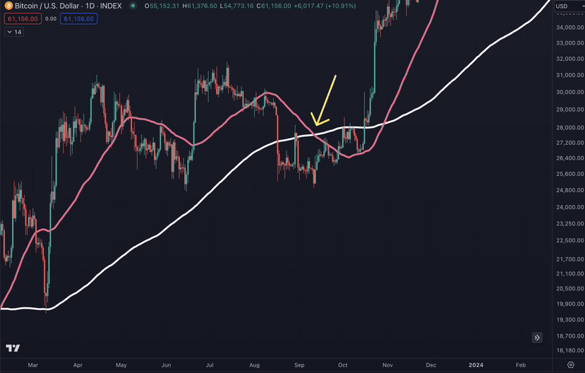 Em 2023,#BTC começou seu rali logo após a cruz da morte. Então, ele ficou acima de sua SMA de 50D e subsequentemente a manteve como suporte antes de subir.