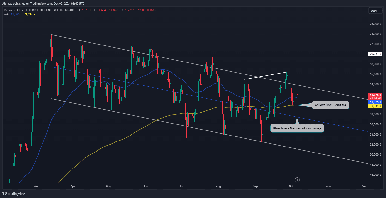 TL;DR: Com base em dados históricos, dois setembro e outubro positivos consecutivos podem indicar uma tendência de alta. Atualmente, esperamos que o Bitcoin confirme essa análise. Tecnicamente, estamos de olho em um novo teste da resistência superior e, se o mercado ficar pessimista, veremos o Bitcoin atingir a 200MA (59,9 mil) novamente e a mediana (57,5 mil) do nosso intervalo. Quebrar abaixo desses níveis pode levar a um declínio em direção ao canal inferior (51,7 mil).
