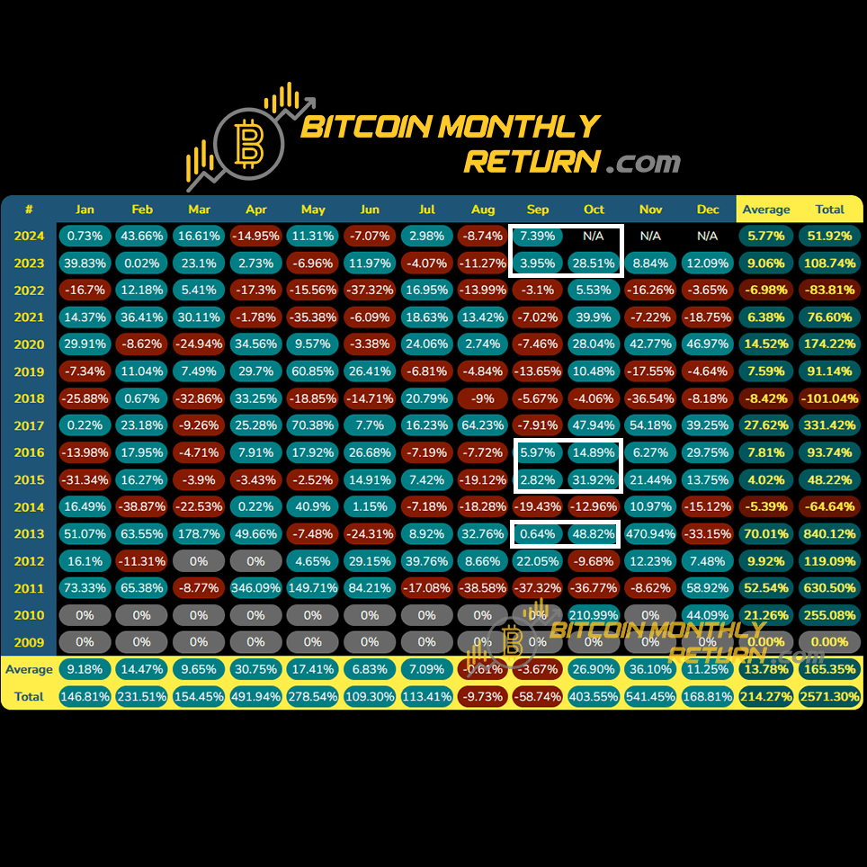 Historicamente, um retorno positivo em setembro seguido por um retorno positivo em outubro, e então uma repetição no ano seguinte, tem sido um indicador otimista. Enquanto eleições, guerras e outros fatores econômicos podem ter efeitos de curto prazo no preço do Bitcoin, ele frequentemente mostrou uma tendência a seguir seus padrões históricos.