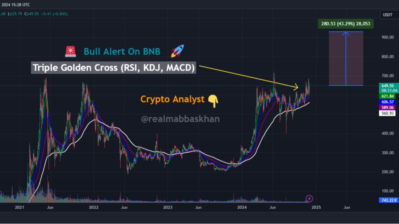 Certo, detentores de BNB, apertem os cintos! Grandes coisas estão acontecendo nos gráficos agora. Estamos vendo uma Cruz Dourada Tripla no período diário, e se você não sabe o que isso significa, é hora de prestar atenção.