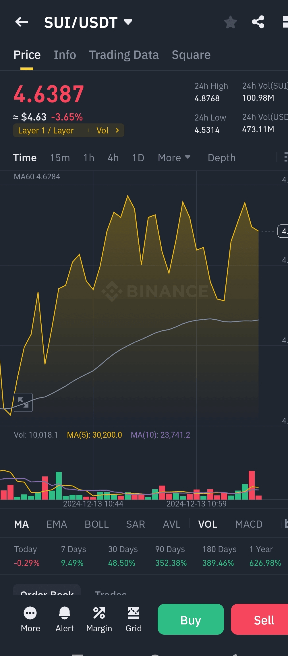 - Volume: O volume de negociação de 24 horas para SUI é de 100,98 milhões, e para USDT, é de 473,11 milhões.