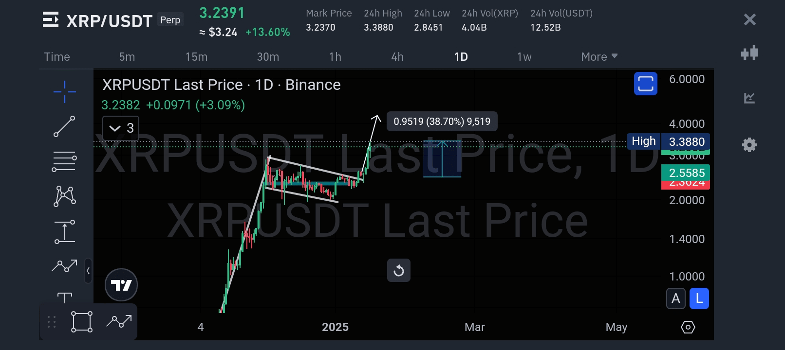 Conforme previsto, o XRP rompeu a estrutura de bandeira com um momentum significativo, subindo direto para a zona-alvo de US$ 3,38. Esse movimento proporcionou um pump notável de 38,7%, recompensando aqueles que agiram com base na análise.