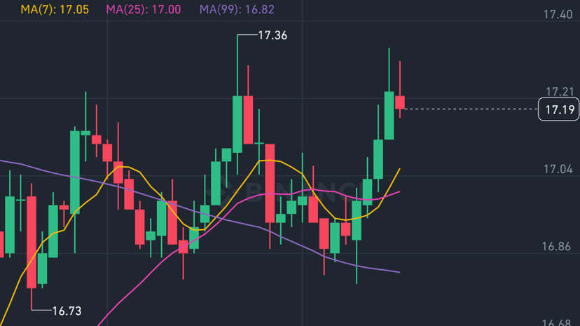 O preço recentemente tocou $17,36, mas enfrentou resistência e caiu ligeiramente.