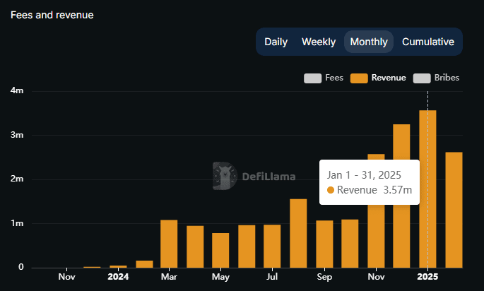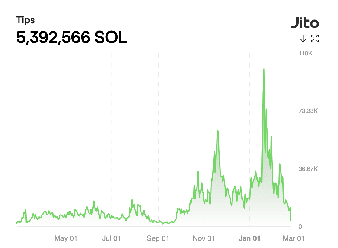 Pode-se ver que a receita da Jito está intimamente ligada à atividade na rede Solana. A partir de outubro de 2024, sua receita aumentou significativamente, ultrapassando 1 milhão semanalmente. Houve dois picos notáveis: em 20 de novembro e 20 de janeiro, quando a receita do protocolo da Jito atingiu 4 milhões e US$ 5,4 milhões, respectivamente, correspondendo a grandes ondas especulativas na cadeia. No entanto, conforme a atividade na cadeia Solana esfriou, sua receita diminuiu rapidamente.